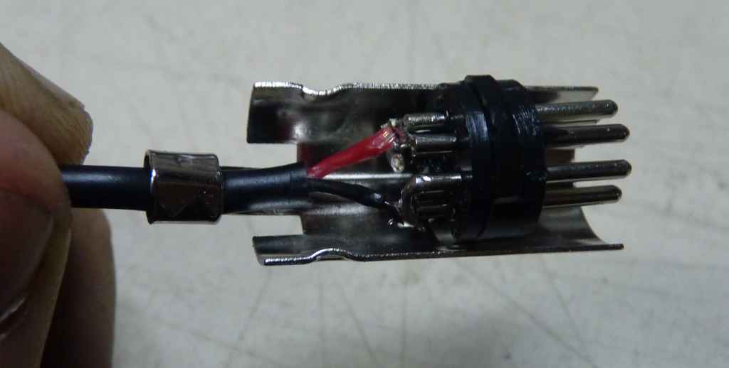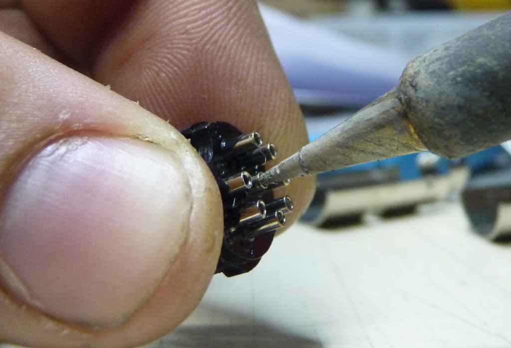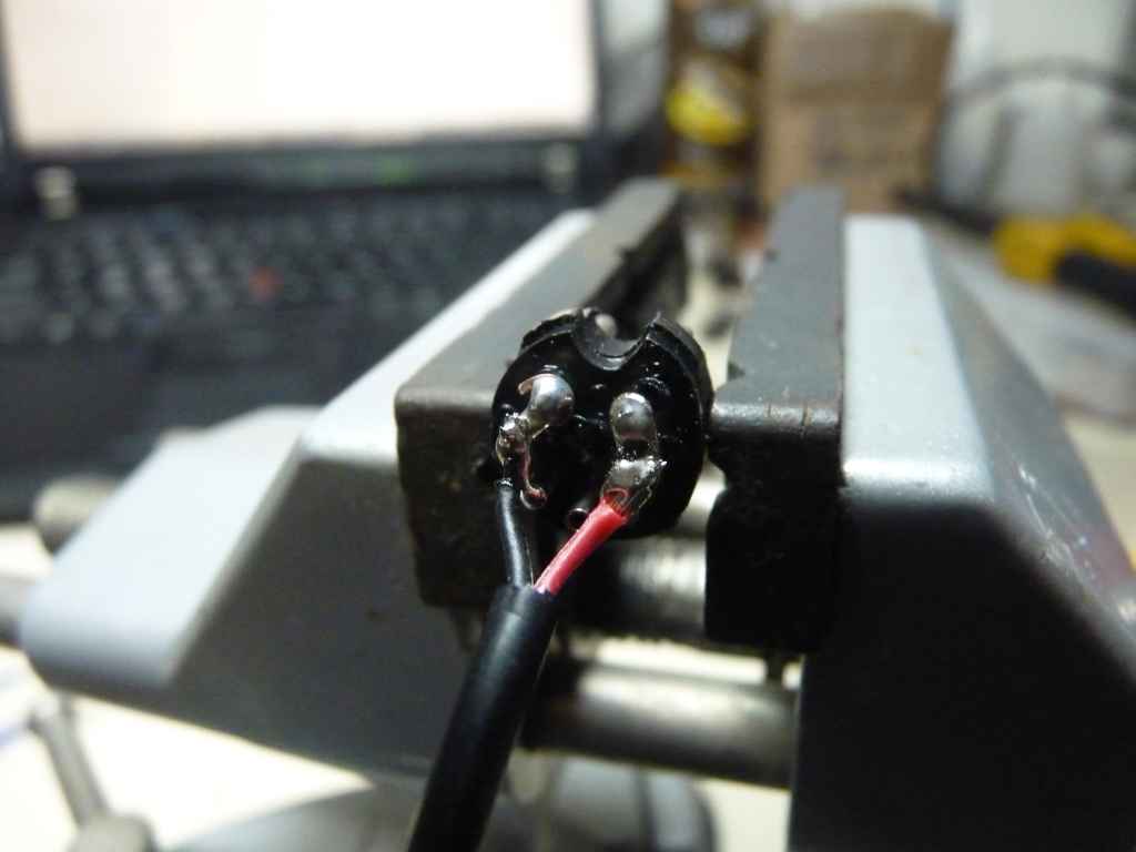 Soldando os fios no lugar. Note que todos os pinos da esquerda (olhando o conector por tras) sao GND (-). E todos os pinos da direita sao VCC (+)