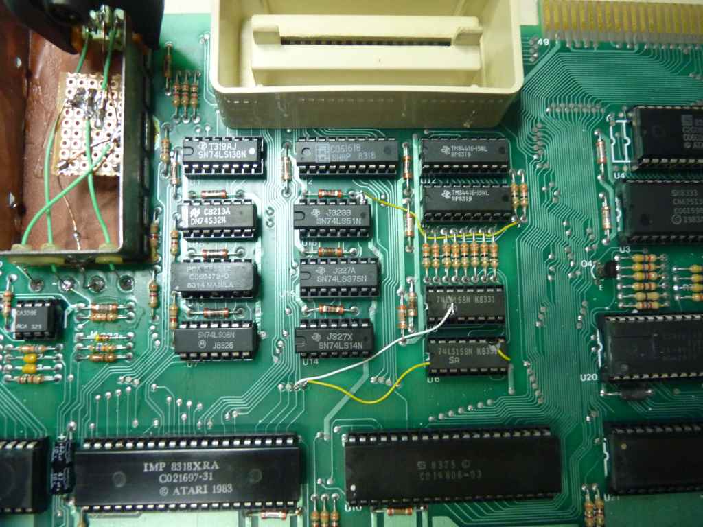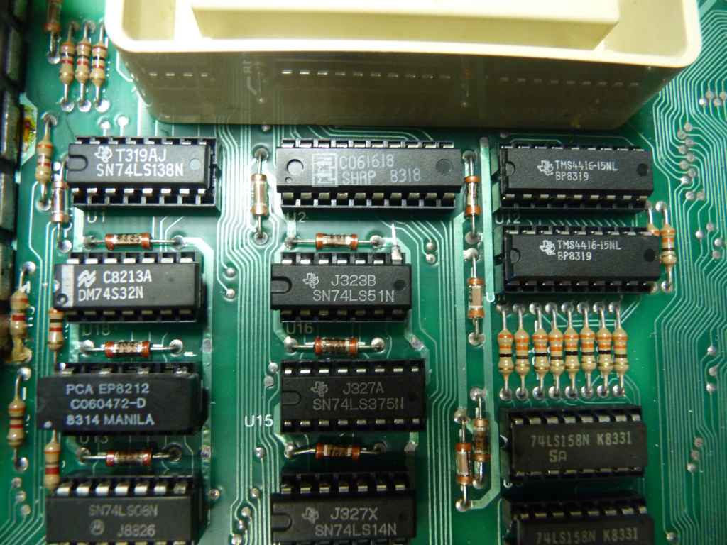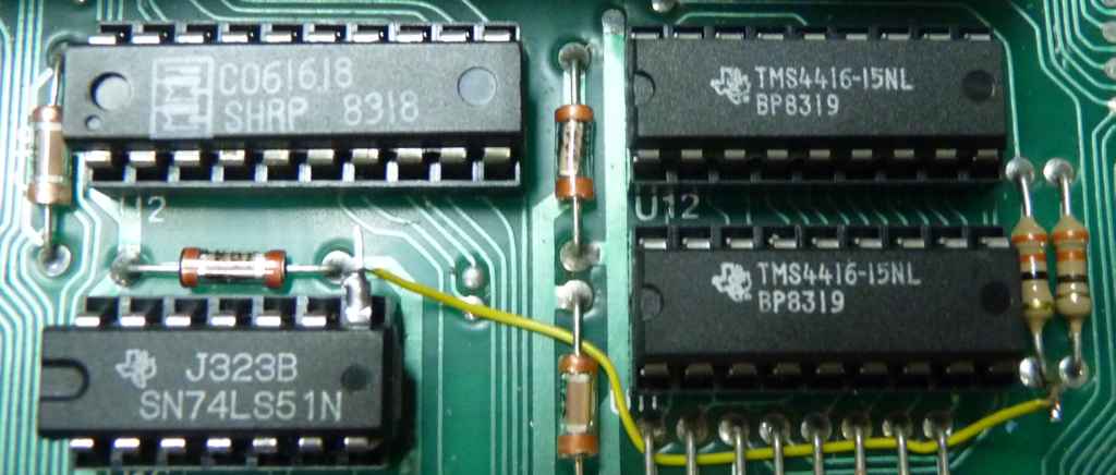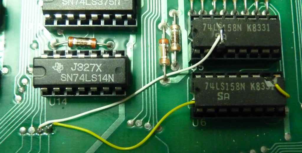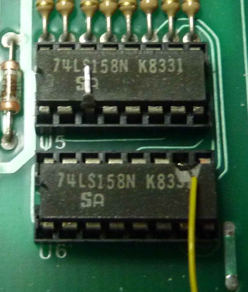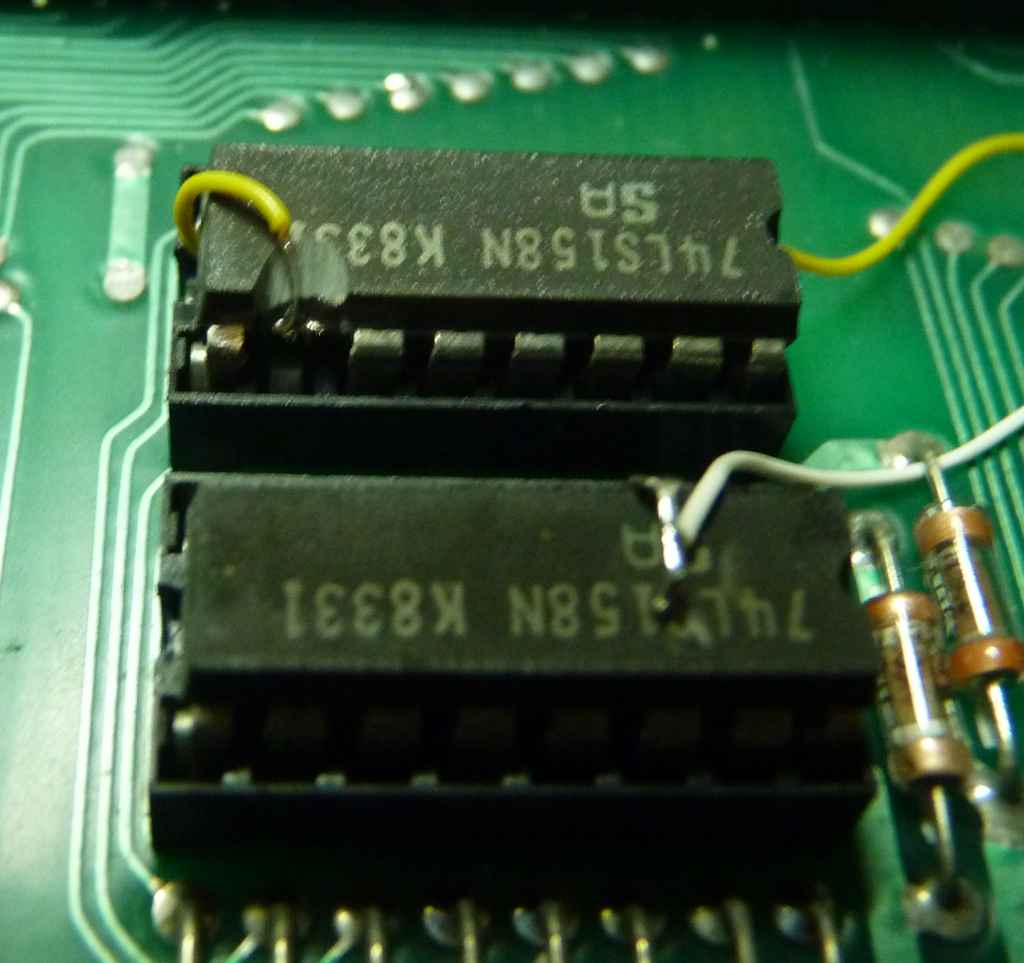 4 - Localize U5 e U6. Sao dois integrados 74LS158, abaixo dos resistores que estao abaixo das 4416. Levante o pino 3 do integrado U5 e o pino 10 do integrado U6. Note que eu fiz uma pequena cagada no pino 10 do U6. Levante o pino com cuidado pra voce nao quebra-lo rente ao integrado e ter que usar suas habilidades ninja com a Dremel e o disco de corte as 1 da madrugada.